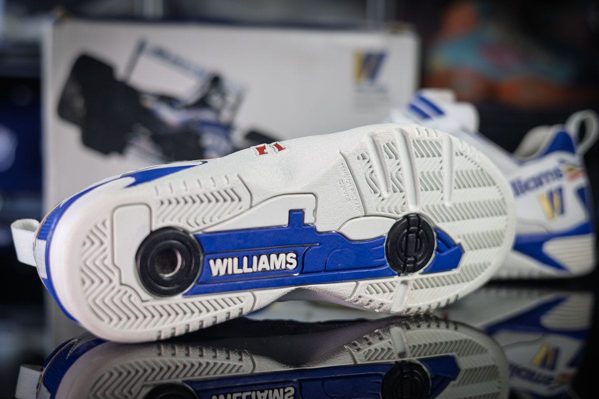 Molded into the bottom of the shoe is a full Formula 1 car… complete with the Williams sidepod branding, front wing, rear wing, and what appear to be functioning rubber wheel hubs on the outsole. I’ve been collecting sneakers for a long time, and I can count on one hand the nummber of shoes that hid an entire piece of storytelling on the bottom of the foot. This is one of them.