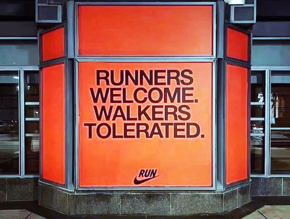 Nike posted a sign at its Newbury Street location in Boston reading “Runners welcome, walkers tolerated.” The sign came down within 24 hours after widespread criticism that the messaging was exclusive. And the internet did what the internet does.