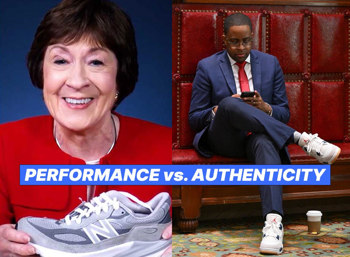 Susan Collins unboxing New Balances for a campaign video isn’t her sharing her love of sneakers. It’s her team recognizing that sneakers poll well with younger demographics and that New Balance has convenient manufacturing ties to her state. It’s focus-grouped relatability packaged as a running pun.